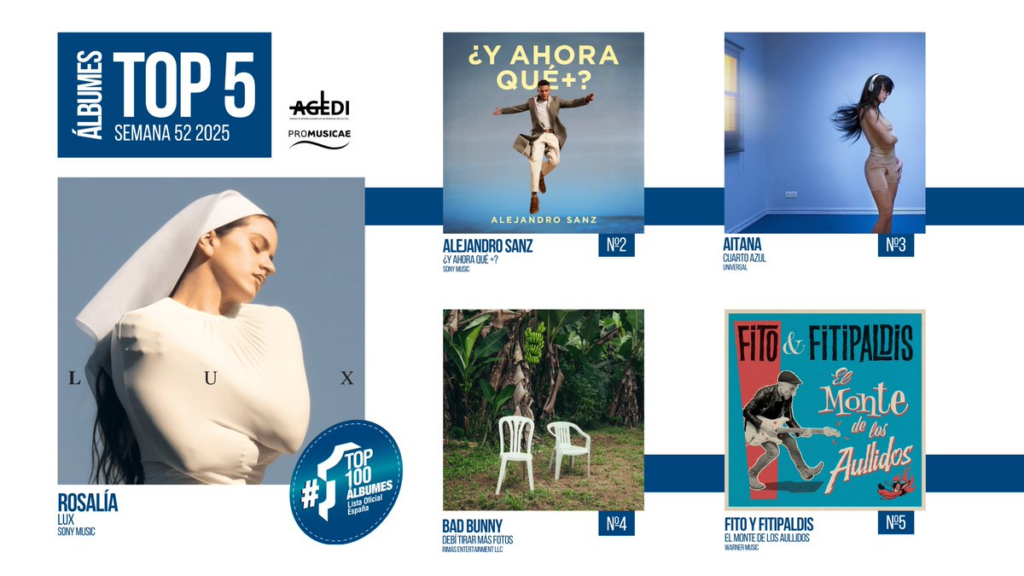 El álbum más vendido de 2025 fue Debí tirar más fotos, de Bad Bunny. El disco lideró las ventas en un año de gran actividad en directo.Sus conciertos agotados reflejan su impacto en el mercado español.